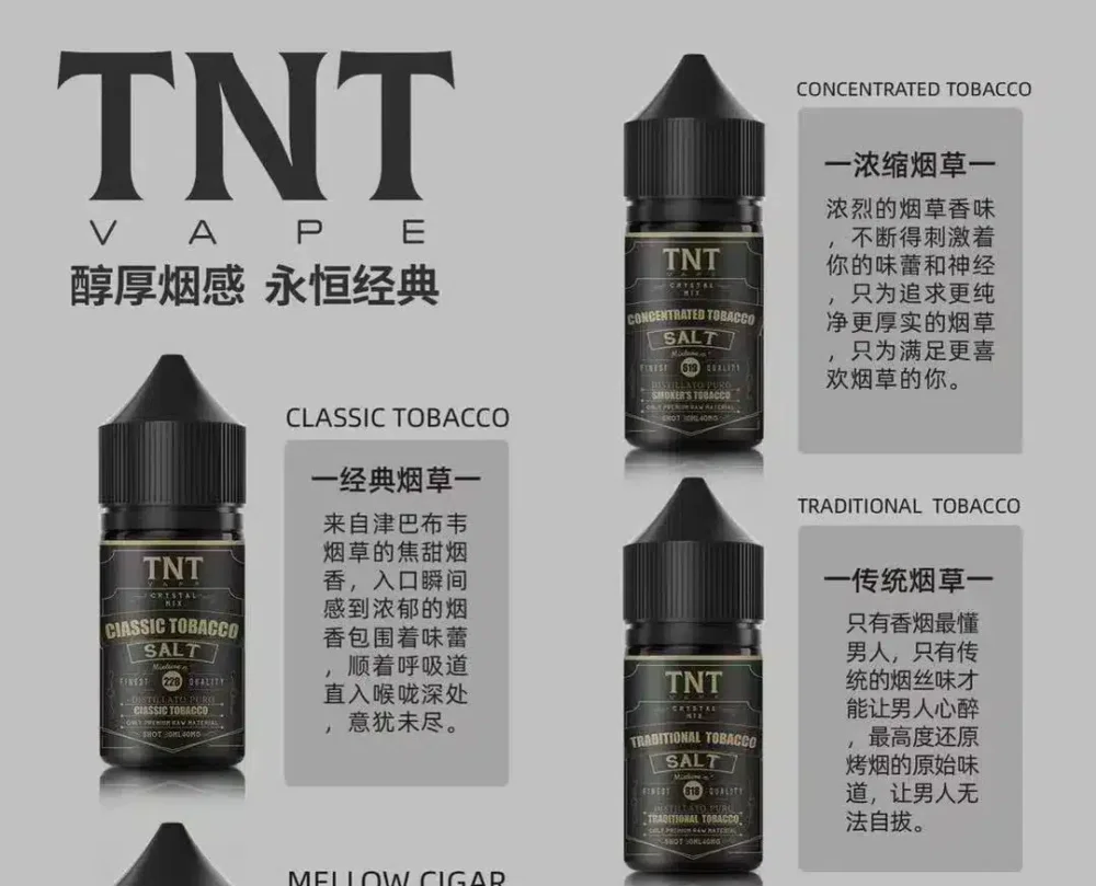 TNT 菸草系列專注於呈現純正煙草風味,透過多樣調香手法,保留濃郁醇厚煙感,滿足各種口感需求。